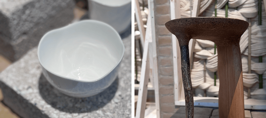Une fois sensibilisé·es à la position idéologique de la biennale clairement exposée et précisée dans le premier espace de l’exposition (extrait du plaidoyer de l’Institut pour un Design Soutenable, ci-dessus), les visiteur·euses sont invité·es à découvrir une remarquable collection d’objets et d’échantillons de matériaux (réunis par Hélène Aguilar) mais également d’œuvres d’art (sélectionnées par Marie-Cassandre Bultheel). Notre regard s’est attardé sur les toiles teintes par Alice Magne à l’aide de cochenille et de pétales de fleurs, également sur la sculpture tricotée de Laurane Desjonquères réalisée avec une laine brute d’alpaga teintée à partir de déchets organiques tels que des pelures d’oignons ou des noyaux d’avocats. Nous retenons aussi la délicate vaisselle en porcelaine de coquilles d’huîtres conçue par Kaomer et, pour l’exposition, disposée sur les pavés Vivaô faits du même biomatériau. De l’animal au végétal, le designer Cédric Breisacher présente une série de tabourets associants des pièces de bois massifs à un nouvelle matière 100% biosourcée : un agglomérat de copeaux, de poussières et de chutes de bois massifs liés avec une colle d’amidon naturelle. Aurélie Hoegy et Laure Julien ravivent quant à elles l’art vannier : la première associe l’une des plus longues fibres végétales – le rotin, à « l’acier végétal » – le bambou, pour créer un banc sculptural ; la deuxième reproduit les techniques de tressage du bambou apprisent auprès de maîtres vanniers japonais pour créer des pièces d’une grande finesse.